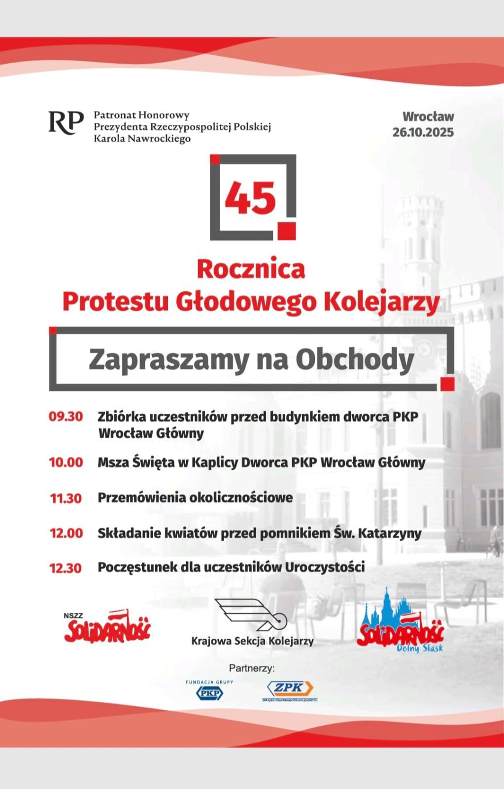 ROCZNICA (45) PROTESTU GŁODOWEGO KOLEJARZY: 26.10.2025 r. PLAKAT. - INSTYTUT DUCHOWOŚCI KARMEL we Wrocławiu (Karmelici Bosi, Wrocław, ul. Ołbińska 1) ZAPRASZA na: