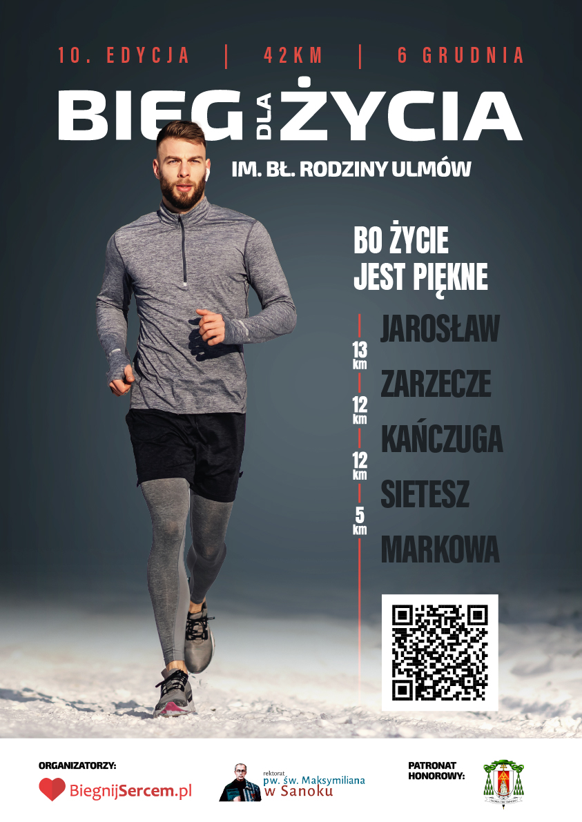 - BIEG DLA ŻYCIA IM. BŁ. RODZINY ULMÓW Z MARKOWEJ: W Jarosławiu w Archidiecezji Przemyskiej 6 grudnia, już po raz 10 odbędzie się Bieg dla Życia im. bł. Rodziny Ulmów z Markowej. To wydarzenie sportowo-religijne, które skupia środowiska biegowe we wspólnym biegu między Jarosławiem a Markową (42 km) manifestując miłość do życia i jego wartość. Zachęcamy do udziału. PLAKAT. REGULAMIN.