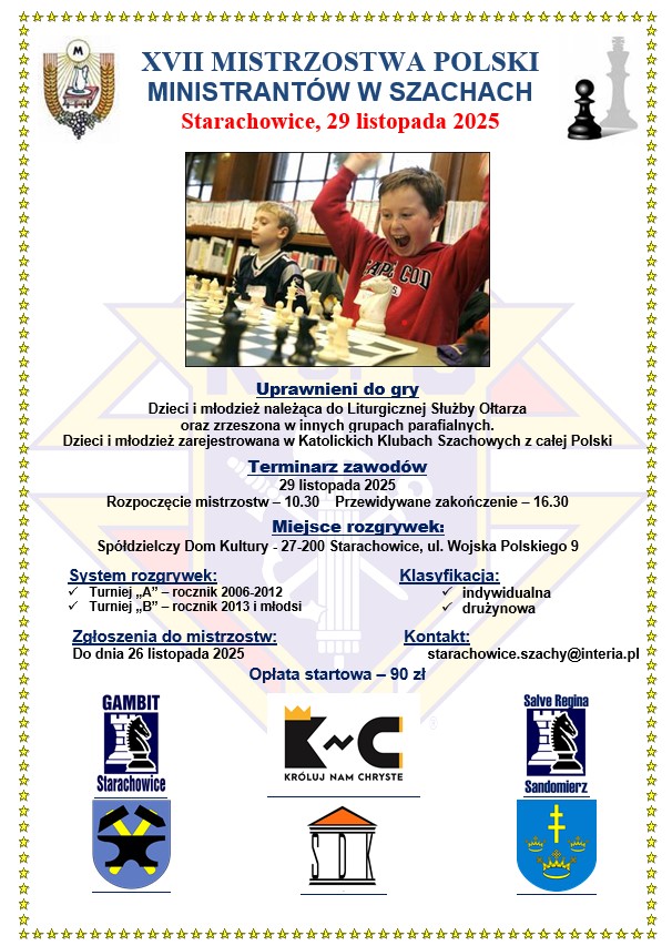 W niedzielę, 14 grudnia br. obchodzimy w Kościele V Dzień Modlitw o Dar Potomstwa którego hasłem przewodnim jest „Źródło nadziei”. Zachęcamy do zorganizowania w parafiach Mszy Świętych i modlitw w tej intencji, by małżeństwa oczekujące na upragnione potomstwo, doświadczyły duszpasterskiej troski i wsparcia. PROPOZYCJA HOMILII, MODLITWY WIERNYCH i PLAKAT wysłałem w komunikatach w dniu 31.10.2025 r. - MISTRZOSTWA POLSKI MINISTRANTÓW W SZACHACH (XVIII): Katolicki Klub Szachowy GAMBIT oraz Klub Szachowy Salve Regina organizują w dniu 29.11.2025 XVIII Mistrzostwa Polski Ministrantów w Szachach.