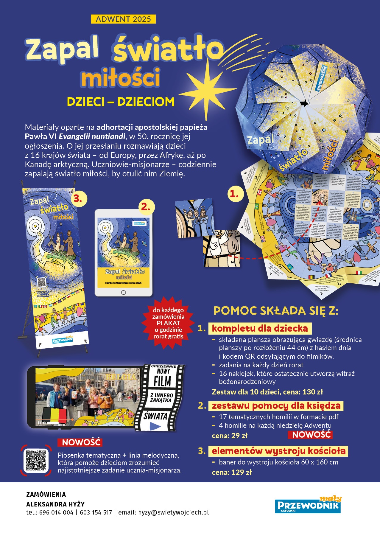 - PROPOZYCJE Wydawnictwa św. Wojciecha NA ADWENT: „Zapal światło miłości" – to wyjątkowe pomoce duszpasterskie na Adwent 2025 . Tegoroczna propozycja roratna to projekt oparty na adhortacji apostolskiej papieża Pawła VI Evangelii nuntiandi – wprowadzają nas w rok duszpasterski przeżywany pod hasłem „Uczniowie-misjonarze". 8 grudnia przypada 50. rocznica ogłoszenia tej adhortacji: jej treść jest wciąż aktualna, a przesłanie precyzyjnie zwraca uwagę na istotę postawy ucznia Jezusa, który jednocześnie staje się misjonarzem. Niezwykłe świadectwa dzieci to współczesna forma ewangelizacji także dla wielu dorosłych. SZCZEGÓŁY. PLAKAT.