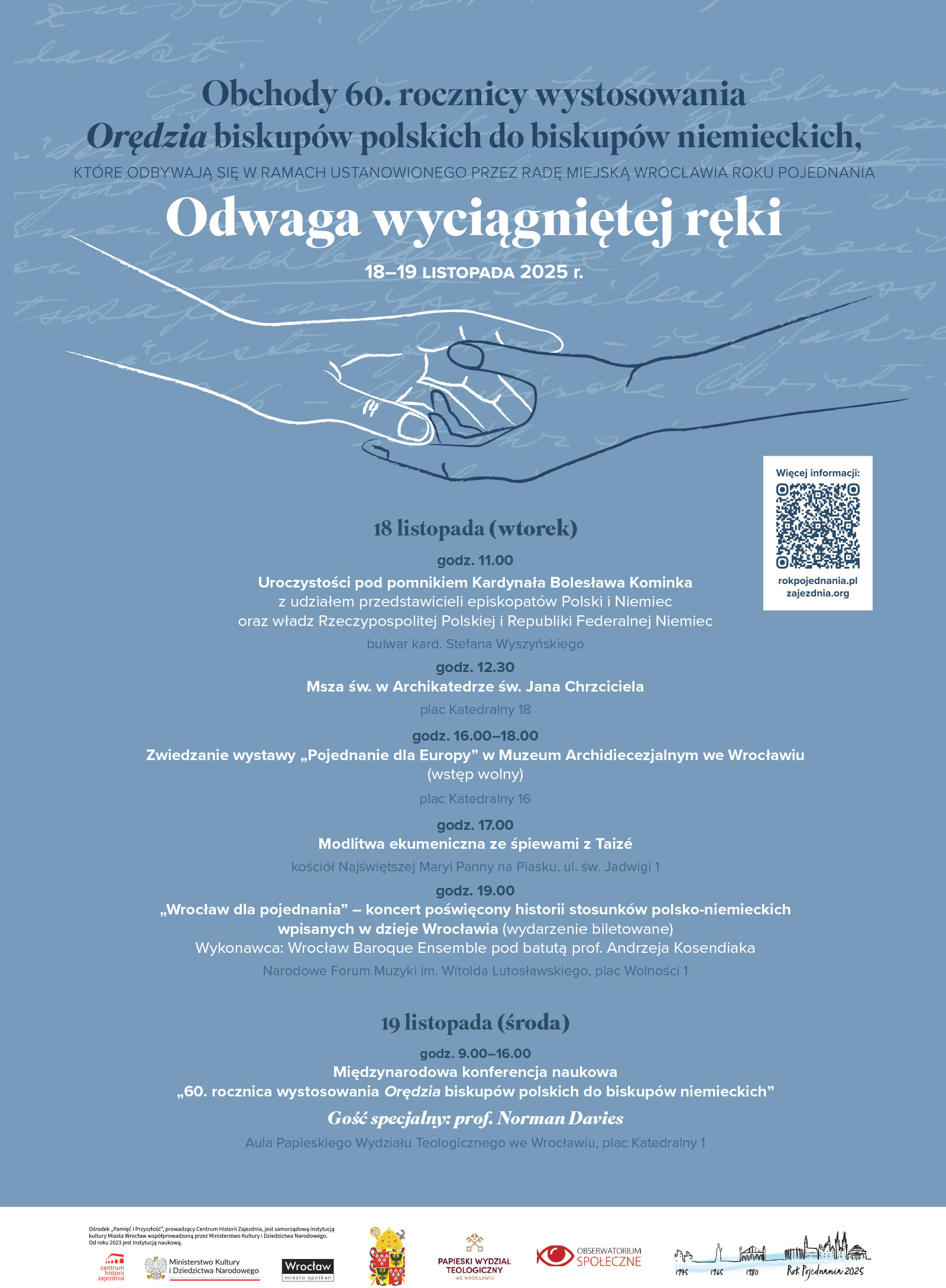 Zgodnie z zarządzeniem wikariusza generalnego Ks. Biskupa Macieja Małygi - niniejszy list Jego Ekscelencji Księdza Arcybiskupa Metropolity Wrocławskiego należy odczytać na wszystkich Mszach Świętych w kościołach i kaplicach Archidiecezji Wrocławskiej w niedzielę 16 listopada br. Prosimy także o udostępnienie treści listu na parafialnych stronach internetowych oraz portalach społecznościowych parafii. - OBCHODY 60 ROCZNICY WYSTOSOWANIA ORĘDZIEA BISKUPÓW POLSKICH DO BISKUPÓW NIEMIECKICH: 18-19 listopada 2025 r. 60 lat temu, polscy biskupi wystosowali do biskupów niemieckich Orędzie, które zmieniło historię Europy. Dokument ten – napisany przez Kardynała Bolesława Kominka – zawierał słowa, które przeszły do historii: „Przebaczamy i prosimy o przebaczenie". Wbrew obowiązującym narracjom, Orędzie proponowało spojrzenie na tysiąc lat sąsiedztwa bez uprzedzeń, z odwagą i empatią. Zawierało katalog wartości, które do dziś pozostają fundamentem pokojowych relacji: prawdę, dialog, przebaczenie. PLAKAT i szczegóły.