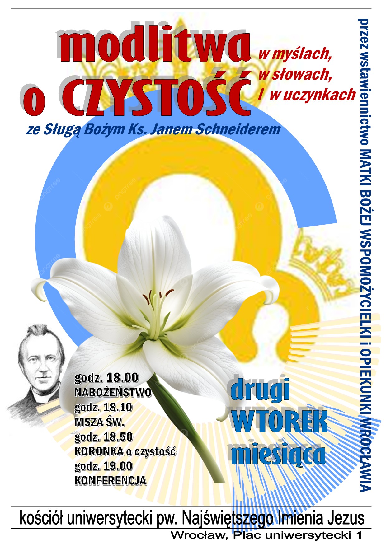 - MODLITWA O CZYSTOŚĆ W MYŚLACH, SŁOWACH I UCZYNKACH ze Sługą Bożym ks. Janem Schneiderem przez wstawiennictwo Matki Bożej Wspomożycielki i Opiekunki Wrocławia – każdy drugi wtorek miesiąca (9 grudnia) godz. 18.00, kościół uniwersytecki we Wrocławiu przy Placu uniwersyteckim 1a. PLAKAT.